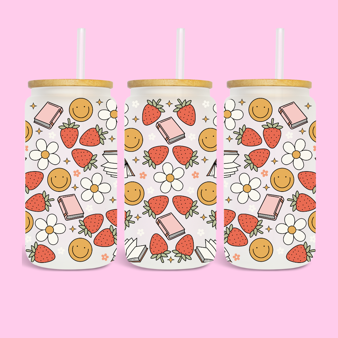 BOOKS SMILES STRAWBERRIES - 16 OZ UV DTF WRAP