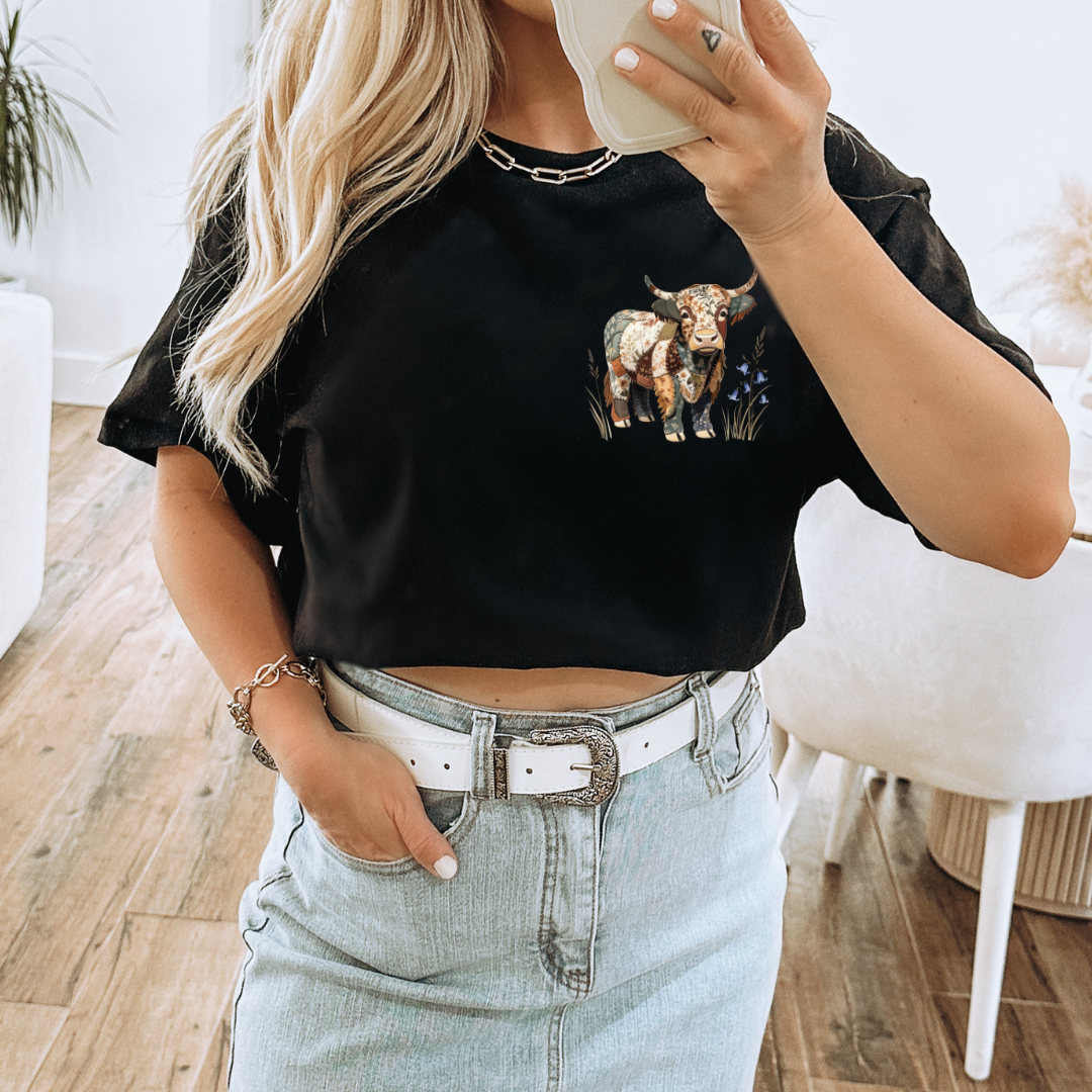 POCKET PATCHWORK HIGHLAND COW - CLEAR FILM SCREEN PRINT